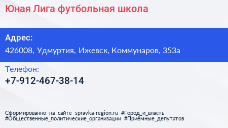 Юная Лига, футбольная школа по адресу 426008, Удмуртия, Ижевск, Коммунаров, 353а в дальнейшем Организация, размещена в следующих категориях: