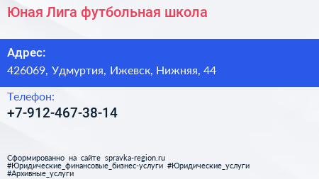 Юная Лига, футбольная школа по адресу 426069, Удмуртия, Ижевск, Нижняя, 44 в дальнейшем Организация, размещена в следующих категориях:
