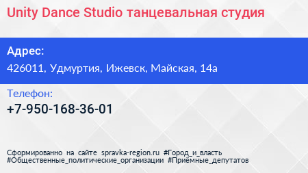 Unity Dance Studio, танцевальная студия по адресу 426011, Удмуртия, Ижевск, Майская, 14а в дальнейшем Организация, размещена в следующих категориях: