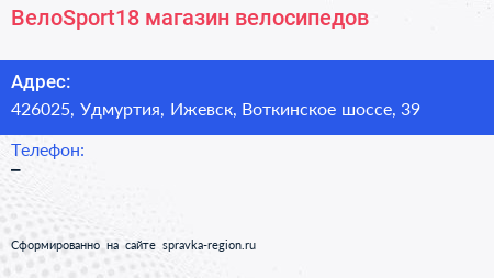 ВелоSport18, магазин велосипедов по адресу 426025, Удмуртия, Ижевск, Воткинское шоссе, 39 в дальнейшем Организация, размещена в следующих категориях: