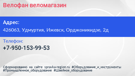 Велофан, веломагазин по адресу 426063, Удмуртия, Ижевск, Орджоникидзе, 2д в дальнейшем Организация, размещена в следующих категориях: