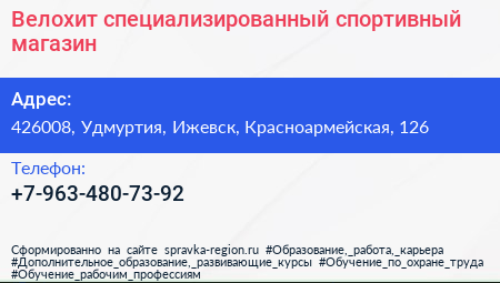 Велохит, специализированный спортивный магазин по адресу 426008, Удмуртия, Ижевск, Красноармейская, 126 в дальнейшем Организация, размещена в следующих категориях: