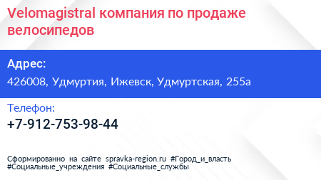 Velomagistral, компания по продаже велосипедов по адресу 426008, Удмуртия, Ижевск, Удмуртская, 255а в дальнейшем Организация, размещена в следующих категориях: