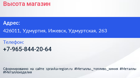 Высота, магазин по адресу 426011, Удмуртия, Ижевск, Удмуртская, 263 в дальнейшем Организация, размещена в следующих категориях: