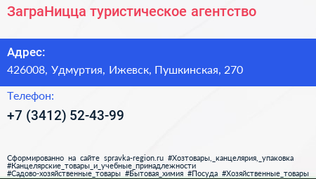 ЗаграНицца, туристическое агентство по адресу 426008, Удмуртия, Ижевск, Пушкинская, 270 в дальнейшем Организация, размещена в следующих категориях: