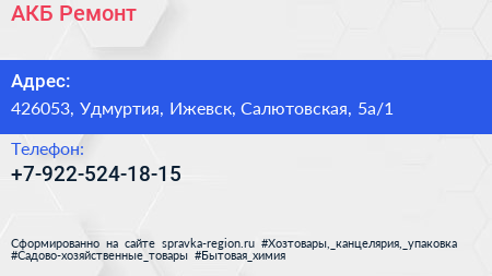 АКБ Ремонт по адресу 426053, Удмуртия, Ижевск, Салютовская, 5а/1 в дальнейшем Организация, размещена в следующих категориях: