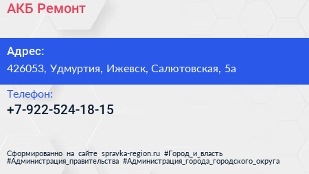 АКБ Ремонт по адресу 426053, Удмуртия, Ижевск, Салютовская, 5а в дальнейшем Организация, размещена в следующих категориях: