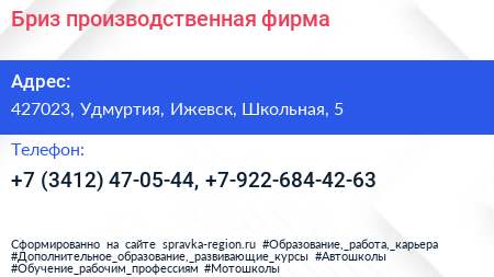 Бриз, производственная фирма по адресу 427023, Удмуртия, Ижевск, Школьная, 5 в дальнейшем Организация, размещена в следующих категориях:
