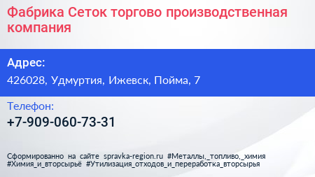 Фабрика Сеток, торгово-производственная компания по адресу 426028, Удмуртия, Ижевск, Пойма, 7 в дальнейшем Организация, размещена в следующих категориях: