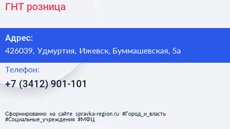 ГНТ розница по адресу 426039, Удмуртия, Ижевск, Буммашевская, 5а в дальнейшем Организация, размещена в следующих категориях: