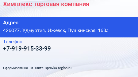 Химплекс, торговая компания по адресу 426077, Удмуртия, Ижевск, Пушкинская, 163а в дальнейшем Организация, размещена в следующих категориях: