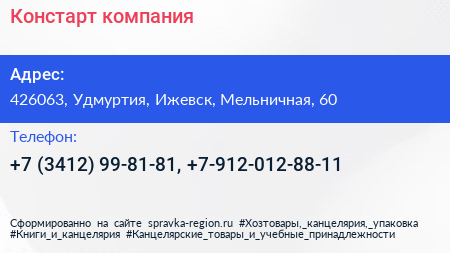 Констарт, компания по адресу 426063, Удмуртия, Ижевск, Мельничная, 60 в дальнейшем Организация, размещена в следующих категориях: