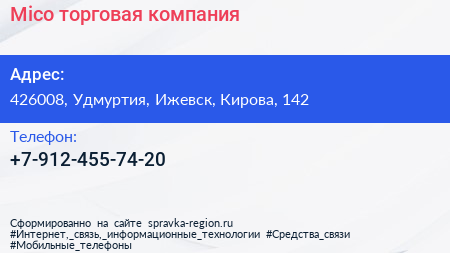 Mico, торговая компания по адресу 426008, Удмуртия, Ижевск, Кирова, 142 в дальнейшем Организация, размещена в следующих категориях: