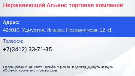 Нержавеющий Альянс, торговая компания по адресу 426010, Удмуртия, Ижевск, Новоажимова, 12 к1 в дальнейшем Организация, размещена в следующих категориях: