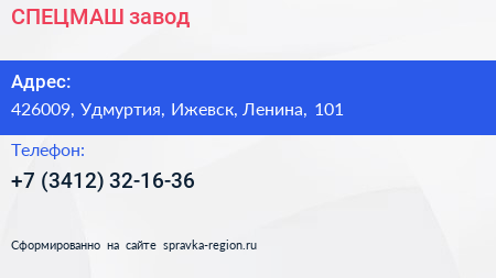 СПЕЦМАШ, завод по адресу 426009, Удмуртия, Ижевск, Ленина, 101 в дальнейшем Организация, размещена в следующих категориях: