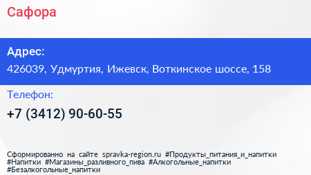 Сафора по адресу 426039, Удмуртия, Ижевск, Воткинское шоссе, 158 в дальнейшем Организация, размещена в следующих категориях: