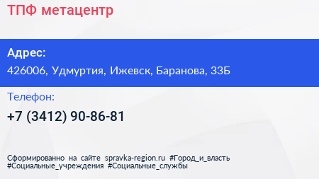 ТПФ метацентр по адресу 426006, Удмуртия, Ижевск, Баранова, 33Б в дальнейшем Организация, размещена в следующих категориях: