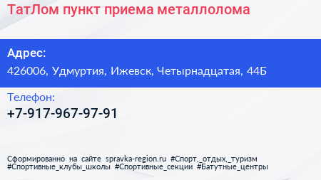 ТатЛом, пункт приема металлолома по адресу 426006, Удмуртия, Ижевск, Четырнадцатая, 44Б в дальнейшем Организация, размещена в следующих категориях: