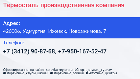 Термосталь, производственная компания по адресу 426006, Удмуртия, Ижевск, Новоажимова, 7 в дальнейшем Организация, размещена в следующих категориях: