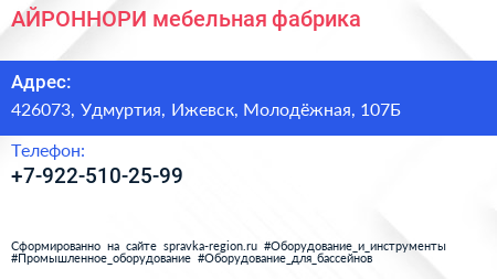 АЙРОННОРИ, мебельная фабрика по адресу 426073, Удмуртия, Ижевск, Молодёжная, 107Б в дальнейшем Организация, размещена в следующих категориях: