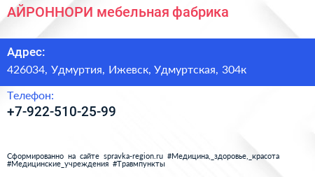 АЙРОННОРИ, мебельная фабрика по адресу 426034, Удмуртия, Ижевск, Удмуртская, 304к в дальнейшем Организация, размещена в следующих категориях: