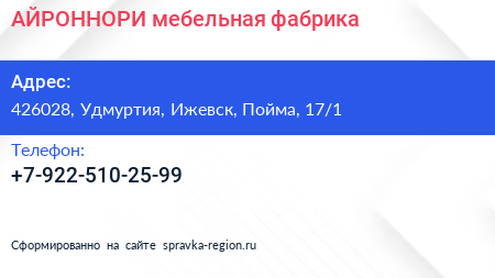 АЙРОННОРИ, мебельная фабрика по адресу 426028, Удмуртия, Ижевск, Пойма, 17/1 в дальнейшем Организация, размещена в следующих категориях: