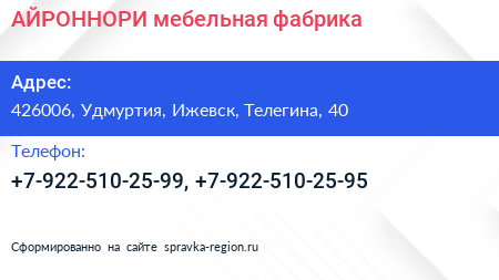 АЙРОННОРИ, мебельная фабрика по адресу 426006, Удмуртия, Ижевск, Телегина, 40 в дальнейшем Организация, размещена в следующих категориях: