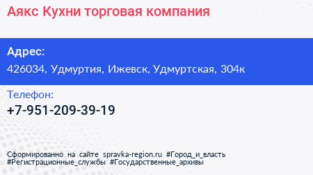 Аякс Кухни, торговая компания по адресу 426034, Удмуртия, Ижевск, Удмуртская, 304к в дальнейшем Организация, размещена в следующих категориях: