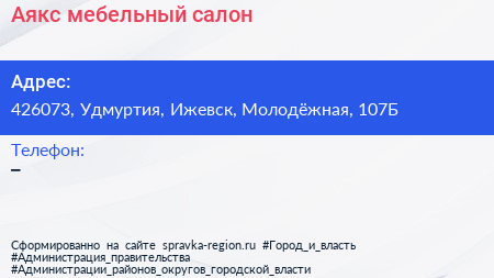 Аякс, мебельный салон по адресу 426073, Удмуртия, Ижевск, Молодёжная, 107Б в дальнейшем Организация, размещена в следующих категориях: