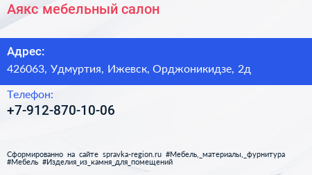 Аякс, мебельный салон по адресу 426063, Удмуртия, Ижевск, Орджоникидзе, 2д в дальнейшем Организация, размещена в следующих категориях: