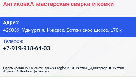 АнтиковкА, мастерская сварки и ковки по адресу 426039, Удмуртия, Ижевск, Воткинское шоссе, 178м в дальнейшем Организация, размещена в следующих категориях: