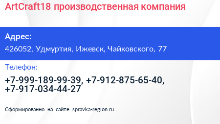 ArtCraft18, производственная компания по адресу 426052, Удмуртия, Ижевск, Чайковского, 77 в дальнейшем Организация, размещена в следующих категориях: