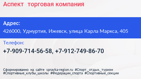 Аспект+, торговая компания по адресу 426000, Удмуртия, Ижевск, улица Карла Маркса, 405 в дальнейшем Организация, размещена в следующих категориях: