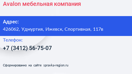 Avalon, мебельная компания по адресу 426062, Удмуртия, Ижевск, Спортивная, 117в в дальнейшем Организация, размещена в следующих категориях: