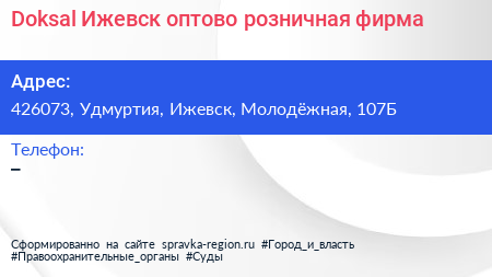 Doksal-Ижевск, оптово-розничная фирма по адресу 426073, Удмуртия, Ижевск, Молодёжная, 107Б в дальнейшем Организация, размещена в следующих категориях: