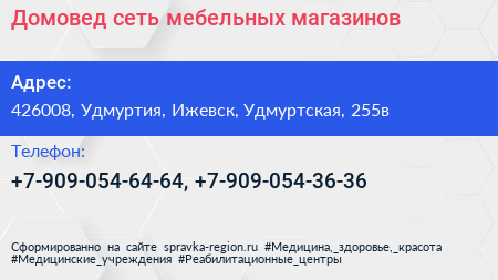 Домовед, сеть мебельных магазинов по адресу 426008, Удмуртия, Ижевск, Удмуртская, 255в в дальнейшем Организация, размещена в следующих категориях: