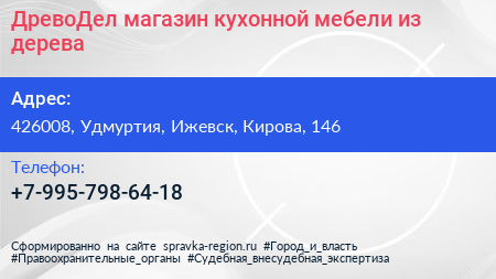 ДревоДел, магазин кухонной мебели из дерева по адресу 426008, Удмуртия, Ижевск, Кирова, 146 в дальнейшем Организация, размещена в следующих категориях: