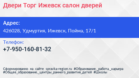 Двери Торг Ижевск, салон дверей по адресу 426028, Удмуртия, Ижевск, Пойма, 17/1 в дальнейшем Организация, размещена в следующих категориях: