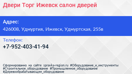 Двери Торг Ижевск, салон дверей по адресу 426008, Удмуртия, Ижевск, Удмуртская, 255в в дальнейшем Организация, размещена в следующих категориях: