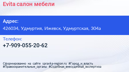 Evita, салон мебели по адресу 426034, Удмуртия, Ижевск, Удмуртская, 304а в дальнейшем Организация, размещена в следующих категориях: