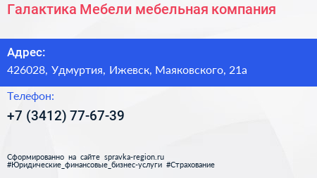 Галактика Мебели, мебельная компания по адресу 426028, Удмуртия, Ижевск, Маяковского, 21а в дальнейшем Организация, размещена в следующих категориях: