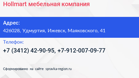 Hollmart, мебельная компания по адресу 426028, Удмуртия, Ижевск, Маяковского, 41 в дальнейшем Организация, размещена в следующих категориях: