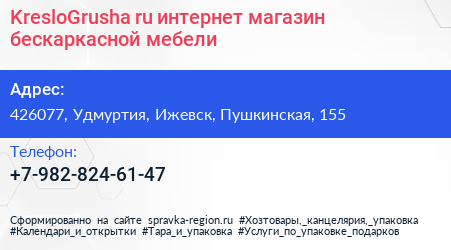 KresloGrusha.ru, интернет-магазин бескаркасной мебели по адресу 426077, Удмуртия, Ижевск, Пушкинская, 155 в дальнейшем Организация, размещена в следующих категориях: