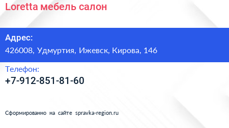Loretta мебель, салон по адресу 426008, Удмуртия, Ижевск, Кирова, 146 в дальнейшем Организация, размещена в следующих категориях: