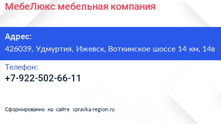 МебеЛюкс, мебельная компания по адресу 426039, Удмуртия, Ижевск, Воткинское шоссе 14 км, 14в в дальнейшем Организация, размещена в следующих категориях: