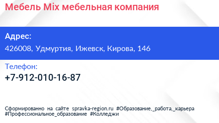 Мебель Mix, мебельная компания по адресу 426008, Удмуртия, Ижевск, Кирова, 146 в дальнейшем Организация, размещена в следующих категориях: