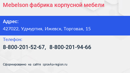 Mebelson, фабрика корпусной мебели по адресу 427022, Удмуртия, Ижевск, Торговая, 15 в дальнейшем Организация, размещена в следующих категориях: