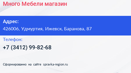 Много Мебели, магазин по адресу 426006, Удмуртия, Ижевск, Баранова, 87 в дальнейшем Организация, размещена в следующих категориях: