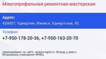 Многопрофильная ремонтная мастерская по адресу 426027, Удмуртия, Ижевск, Удмуртская, 81 в дальнейшем Организация, размещена в следующих категориях: