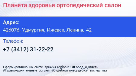 Планета здоровья, ортопедический салон по адресу 426076, Удмуртия, Ижевск, Ленина, 42 в дальнейшем Организация, размещена в следующих категориях:
